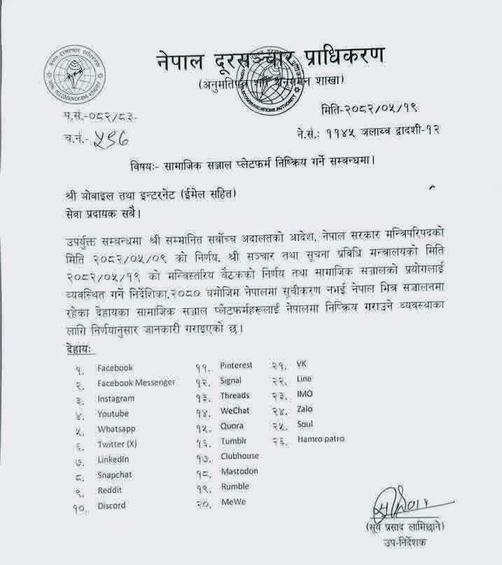 प्रतिबंधित प्लेटफॉर्म्स की सूची में फेसबुक, इंस्टाग्राम, व्हाट्सएप, यूट्यूब, एक्स (पूर्व में ट्विटर), लिंक्डइन, रेडिट, स्नैपचैट, डिस्कॉर्ड, पिंटरेस्ट, सिग्नल, थ्रेड्स, वीचैट, क्वोरा, टंबलर, क्लबहाउस, मास्टोडन, रंबल, वीके, लाइन, आईएमओ, जालो, सोल, और हमरो पात्रो शामिल हैं।
