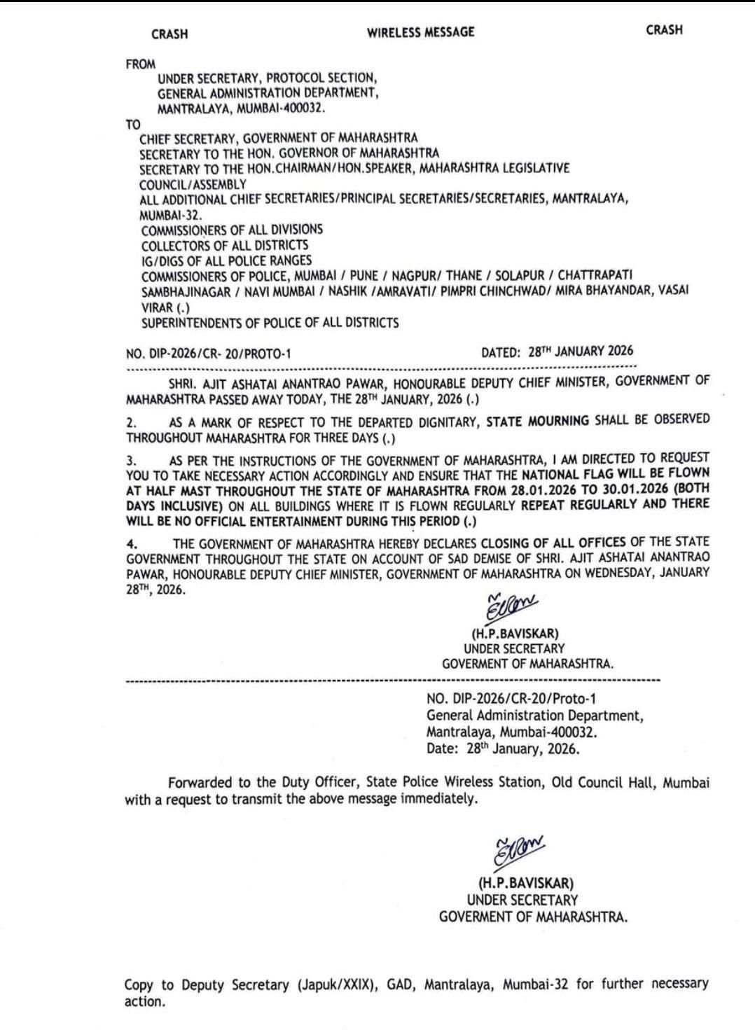 महाराष्ट्र सरकार ने उपमुख्यमंत्री अजित अनंतराव पवार के 28 जनवरी 2026 को बारामती में विमान दुर्घटना में दुखद निधन पर तीन दिन का राज्य शोक घोषित किया है। सामान्य प्रशासन विभाग (प्रोटोकॉल शाखा) द्वारा जारी संदेश में राज्यभर के अधिकारियों को निर्देश दिए गए हैं कि इस अवधि में राष्ट्रीय ध्वज आधा झुका रहेगा और कोई आधिकारिक मनोरंजन कार्यक्रम आयोजित नहीं होगा।