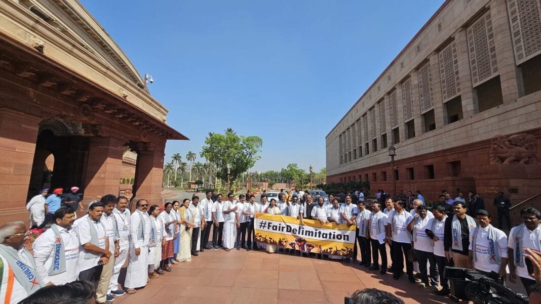 लोकसभा की कार्यवाही दो बार के स्थगन के बाद अपराह्न दो बजे जैसे ही शुरु हुई, टी-शर्ट पहने द्रमुक सदस्य परिसीमन के विरोध में नारे लगाते हुए सदन के बीचोंबीच आकर हंगामा करने लगे।