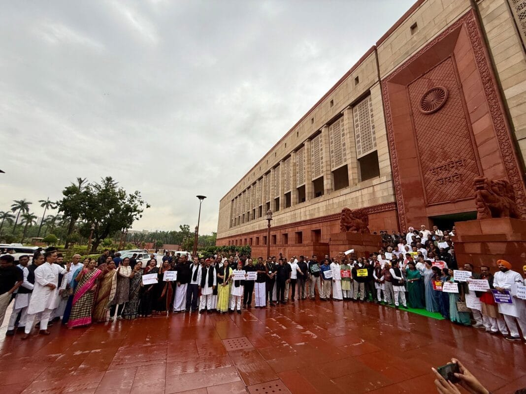 नई दिल्ली, (वेब वार्ता)। संसद के मानसून सत्र के तीसरे दिन बुधवार को कांग्रेस के पूर्व अध्यक्ष एवं लोकसभा में विपक्ष के नेता राहुल गांधी के नेतृत्व में इंडिया गठबंधन के नेताओं ने संसद भवन परिसर में प्रदर्शन किया। इसमें समाजवादी पार्टी के अध्यक्ष अखिलेश यादव सहित कई प्रमुख विपक्षी नेता शामिल हुए। कांग्रेस, समाजवादी पार्टी, राष्ट्रीय जनता दल (आरजेडी), द्रविड़ मुनेत्र कड़गम (द्रमुक) और अन्य विपक्षी दलों के नेताओं ने एकजुट होकर इस प्रक्रिया के खिलाफ आवाज बुलंद की।