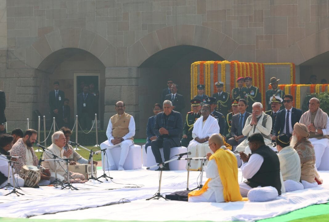 राष्ट्रपति द्रौपदी मुर्मू, उपराष्ट्रपति जगदीप धनखड़ और प्रधानमंत्री नरेंद्र मोदी ने इस महत्वपूर्ण समारोह का नेतृत्व किया, जिसमें अन्य वरिष्ठ नेताओं ने भी राष्ट्रपिता महात्मा गांधी को श्रद्धांजलि अर्पित की।