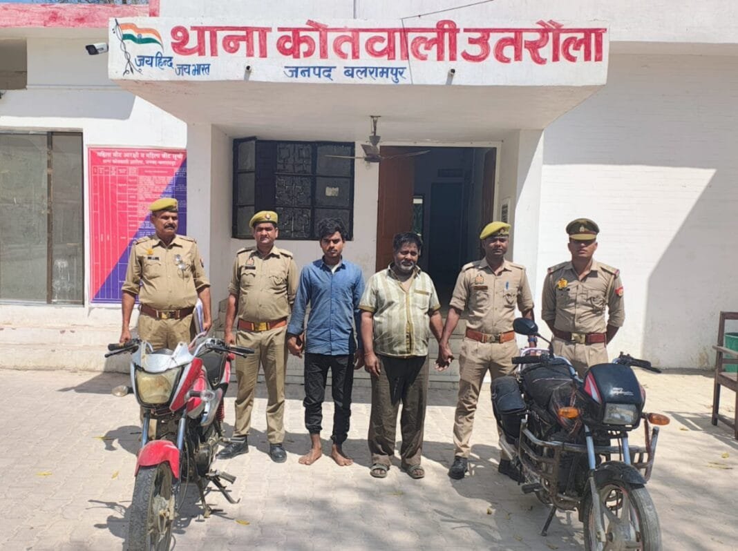 थाना स्थानीय पर पंजीकृत मु0अ0सं0 254/24 धारा 303(2) बी0एन0एस0 व मु0अ0सं0 24/25 धारा 303(2) बी0एन0एस0 में चोरी गई मोटरसाइकिल की पतारसी सुरागरसी हेतु उ0नि0 सुरेश सिंह मय हमराह उ0नि0 श्री मनीष कुमार मिश्र, उ0नि0 श्री हीरालाल, हे0कां0 रणवीर गौतम व कां0 अनुभव सिंह क्षेत्र में भ्रमणशील थे कि जरिए मुखबिर खास सूचना मिली कि 03 व्यक्ति 02 अदद मोटर साइकिल के साथ उतरौला गोण्डा मार्ग पर भुजवनडीह जाने वाली खड़ंजे के बगल आम और सागौन के बाग में खड़े है। इस सूचना पर पुलिस टीम मौके पर पहुंचकर देखा कि तीन लोग 02 मोटर साइकिल के साथ बाग में खड़े थे तथा पुलिस को अपनी तरफ आता देखकर भागने का प्रयास किये पुलिस टीम ने एक बारगी दौड़ कर घेराबंदी करते हुये तीनो व्यक्तियों को पकड़ कर नाम पता पूछते हुये भागने का कारण पूछा गया तो उनमें से एक व्यक्ति ने अपना नाम अहमद रजा पुत्र अब्दुल हन्नान निवासी जलापुरवा थाना को0 उतरौला जनपद बलरामपुर उम्र करीब 24 वर्ष बताया। दूसरे ने अपना नाम ज्ञान प्रकाश कौशल पुत्र स्व0 रमाशंकर कौशल निवासी मुजहना थाना श्रीदत्तगंज जनपद बलरामपुर उम्र करीब 50 वर्ष तथा तीसरे व्यक्ति बाल अपचारी ने अपना पता थाना श्रीदत्तगंज बलरामपुर बताया। मोटर साइकिलों का कागजात तलब किया गया तो नही दिखा पाये, सक होने पर दोनो मोटरसाइकिलों के चेंचिस नंबर की जांच की गयी तो पता चला कि दोनो मोटरसाइकिल मु0अ0सं0 254/24 धारा 303(2) बी0एन0एस0 व मु0अ0सं0 24/25 धारा 303(2) बी0एन0एस0 में चोरी गयी थी वही हैं । कड़ाई से पूछताछ करने पर तीनो अभियुक्तों ने बताया कि हम तीनो ही मिलकर यह दोनो मोटर साइकिल चुरायी थी,