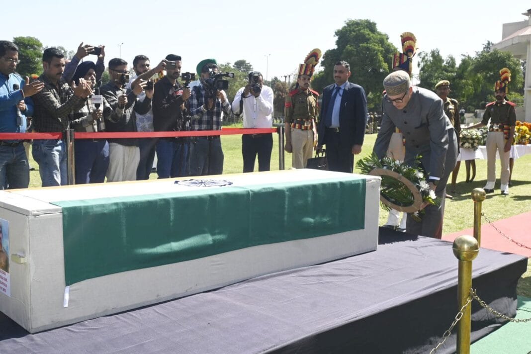 अब्दुल्ला ने गुलशन ग्राउंड स्थित पुलिस मुख्यालय में पुलिस चौकी सफियान के प्रभारी प्रधान सिपाही जगबीर सिंह के पार्थिव शरीर पर पुष्पचक्र अर्पित किया।