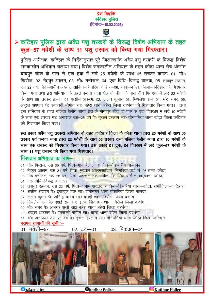 कटिहार पुलिस ने अवैध पशु तस्करी के खिलाफ चलाए जा रहे विशेष समकालीन अभियान के तहत बड़ी कार्रवाई करते हुए जिले के तीन थाना क्षेत्रों से 57 मवेशियों को जब्त किया है, जबकि 11 पशु तस्करों को गिरफ्तार किया गया है। पुलिस के अनुसार, गिरफ्तार आरोपियों में अंतरराज्यीय पशु तस्कर गिरोह से जुड़े सदस्य भी शामिल हैं।