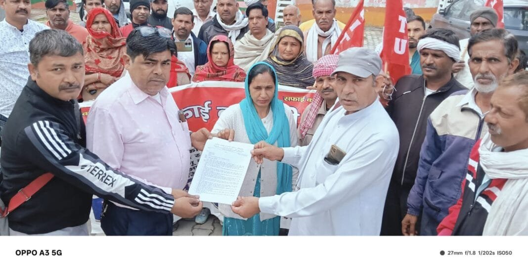 ग्रामीण सफाई कर्मियों ने प्रदर्शन कर लंबित मांगों का ज्ञापन भाजपा के प्रदेश अध्यक्ष के पी ए को सौंपा