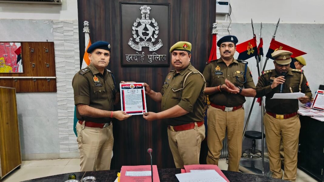 हरदोई, लक्ष्मीकान्त पाठक (वेब वार्ता)। ईमानदार व तेज तर्रार पुलिस अधीक्षक नीरज कुमार जादौन पुलिस मित्र के प्रति आमजनमानस में इजाफा बढ़ाने के लिए दोषी पुलिस कर्मियों पर कार्यवाही व अच्छे कार्य करने वाले पुलिसकर्मियों को प्रशस्ति पत्र देकर हौसला अफजाई करते हैं। जिससे पुलिस कर्मियों का हौसला बढ़ता है। बेहतर कार्य कर कानून व्यवस्था को बेहतर करते हैं। पुलिस अधीक्षक की कार्यशैली से आमजनमानस में विश्वास का इजाफा हुआ है। पुलिस विभाग में व्याप्त भ्रष्टाचार को खत्म करने के लिए वह सदैव प्रयासरत हैं। शनिवार को जिले की पुलिस लाइन में स्थित सभागार कक्ष में जिले के पुलिस कर्मियों द्वारा उत्कृष्ट कार्य करने वाले पुलिस कर्मी प्रभारी निरीक्षक विनोद कुमार थाना कछौना, वरिष्ठ उप निरीक्षक संजीव कुमार शाक्य, उपनिरीक्षक मोइन अहमद थाना कसौना, हेड कांस्टेबल राजेंद्र कुमार, विकास शर्मा थाना कछौना, कांस्टेबल सनी कुमार, रोहित कुमार सहित जिले के पुलिस कर्मियों को पुलिस अधीक्षक द्वारा प्रशस्ति पत्र देकर सम्मानित किया गया। पुलिस अधीक्षक द्वारा प्रशस्ति पत्र पाकर पुलिस कर्मी काफी उत्साहित हुए।