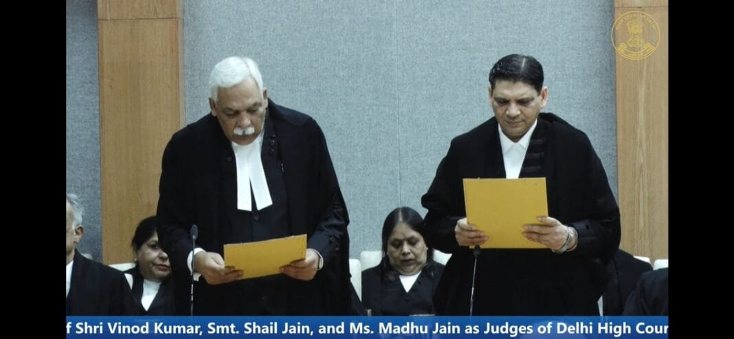 नई दिल्ली, (वेब वार्ता)। दिल्ली हाईकोर्ट में न्यायिक क्षमता को सुदृढ़ करने की दिशा में एक महत्वपूर्ण कदम उठाते हुए तीन नए न्यायाधीशों – विनोद कुमार, शैल जैन और मधु जैन – ने 24 जुलाई को पद की शपथ ली। यह शपथ समारोह हाईकोर्ट परिसर में आयोजित हुआ, जहां दिल्ली हाईकोर्ट के मुख्य न्यायाधीश देवेंद्र कुमार उपाध्याय ने तीनों को पद की शपथ दिलाई। विशेष बात यह रही कि तीनों न्यायाधीशों ने अपनी शपथ हिंदी भाषा में ली, जो भारतीय न्याय प्रणाली में भाषाई समावेशिता की दिशा में एक सराहनीय संकेत है।