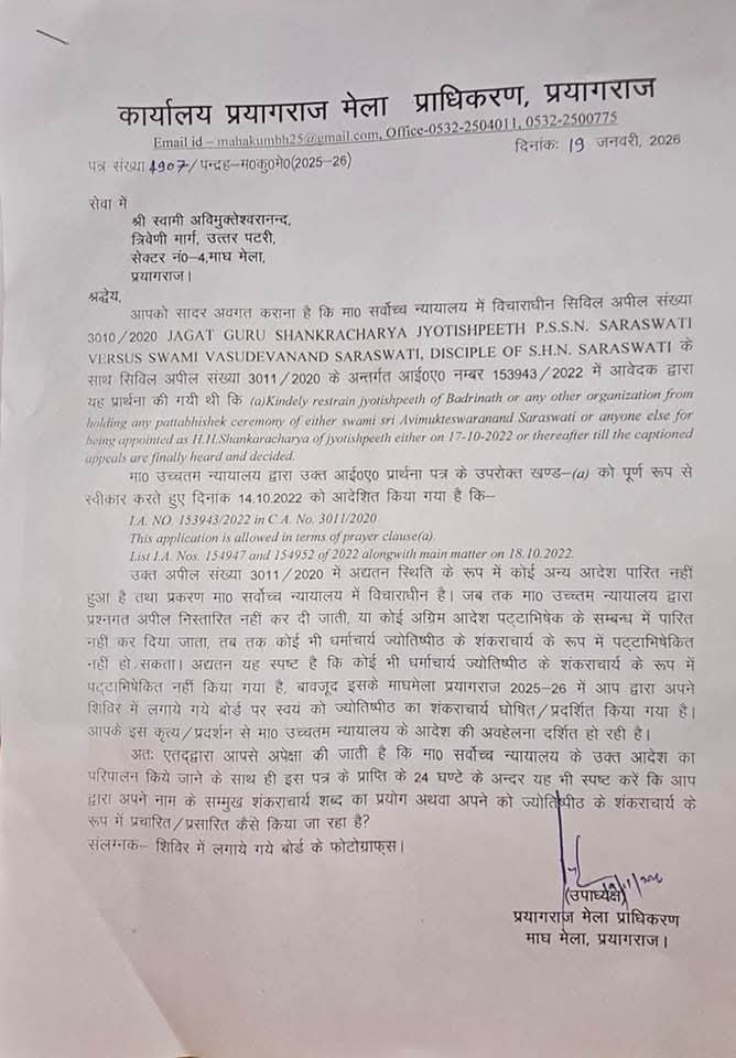 यह नोटिस उस समय जारी किया गया है जब हाल ही में मौनी अमावस्या स्नान के दौरान स्वामी अविमुक्तेश्वरानंद और उनके अनुयायियों का मेला प्रशासन से टकराव हुआ था।
